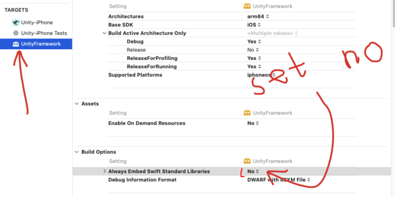 결론적으로 UnityFramework에서의 Embed Swift slib는 기본 yes인데 no가 맞다. 특별한 경우가 아니라면.