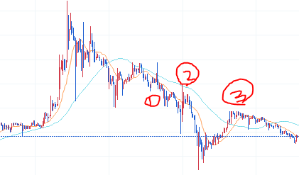 1의 경우 탈출 의향을 가지게 되고, 2의 경우 대부분은 탈출하고 3에 이르러서 손실을 각오했던 홀더들에게 다른 털기를 강요하게 된다. 그러고 나서 다시 살짝 상승세로 돌아서는 경우가 종종 보여진다.